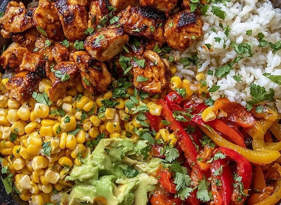 - Pour assembler les bols, disposez d’abord une base de riz, puis ajoutez le maïs, le poulet, les poivrons et les oignons. Garnissez avec la salade, l’avocat, le fromage émietté et un peu de coriandre fraîche. Terminez en arrosant généreusement de vinaigrette.