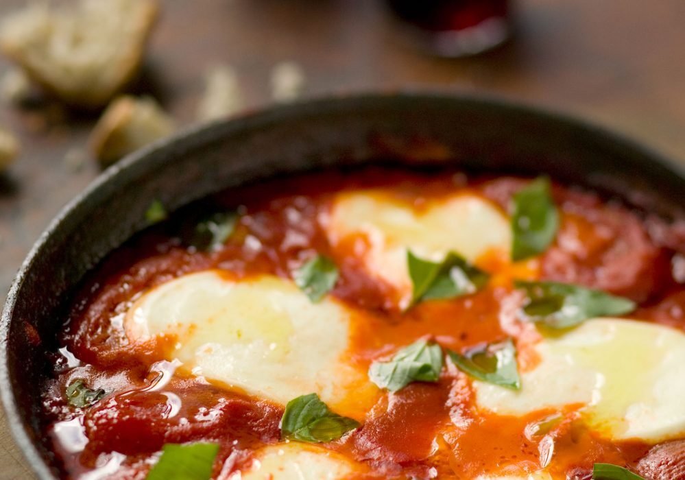 Servir directement dans la poêle, à la manière d’une fondue, en trempant simplement des morceaux de pain de campagne dans la sauce tomate et la mozzarella fondante. Un plat simple, convivial et plein de saveurs.