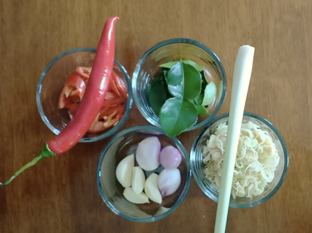 1 – Citronnelle: on coupe les bâtons en fines tranches, on n’utilise que la partie blanche qui est la plus tendre. Le reste, tu peux le conserver au frais ou au congélateur et l’utiliser pour préparer une soupe (Tom yam ou Tom Ka)