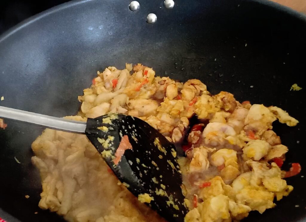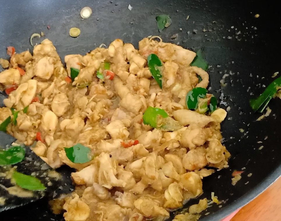 2. Ajoute le poulet et fais-le dorer. Lorsque le poulet a changé de couleur, ajoute la sauce d’huitre, la sauce soja, la sauce de poisson et le sucre.