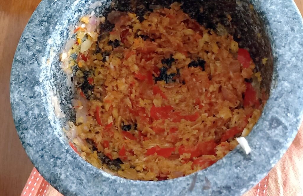 5 – Dans un mortier, réduis en poudre les grains de poivre. Ajoute l’ail et les échalotes et écrase-les grossièrement.. Ajoute la moitié de la citronnelle, le piment et le curcuma et réduis le tout en une pâte grossière.