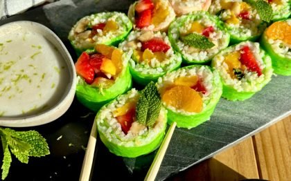 Une version fun et gourmande des sushis, mais en mode sucré. Avec du riz parfumé, des fruits frais et une petite sauce coco au sirop d’érable… c’est frais, original et super facile à faire à la maison !